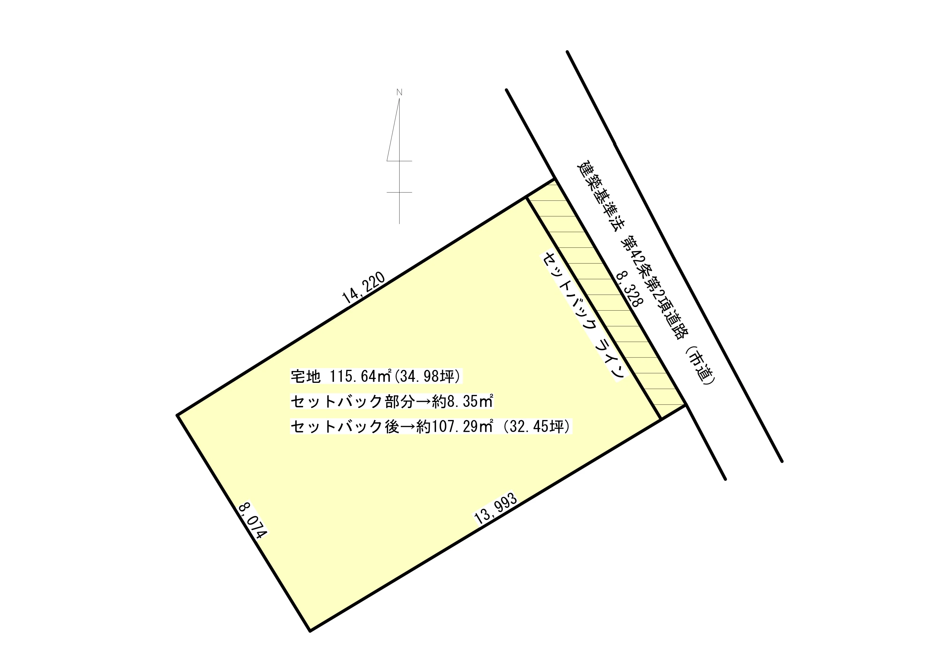 接道については、建築基準法第42条第2項道路に接しており、セットバックが必要となります。進入路の幅員は約1.85mですが、法令上の要件を満たすことで建築が可能です。詳細な建築計画については、事前に確認を行うことをおすすめします。